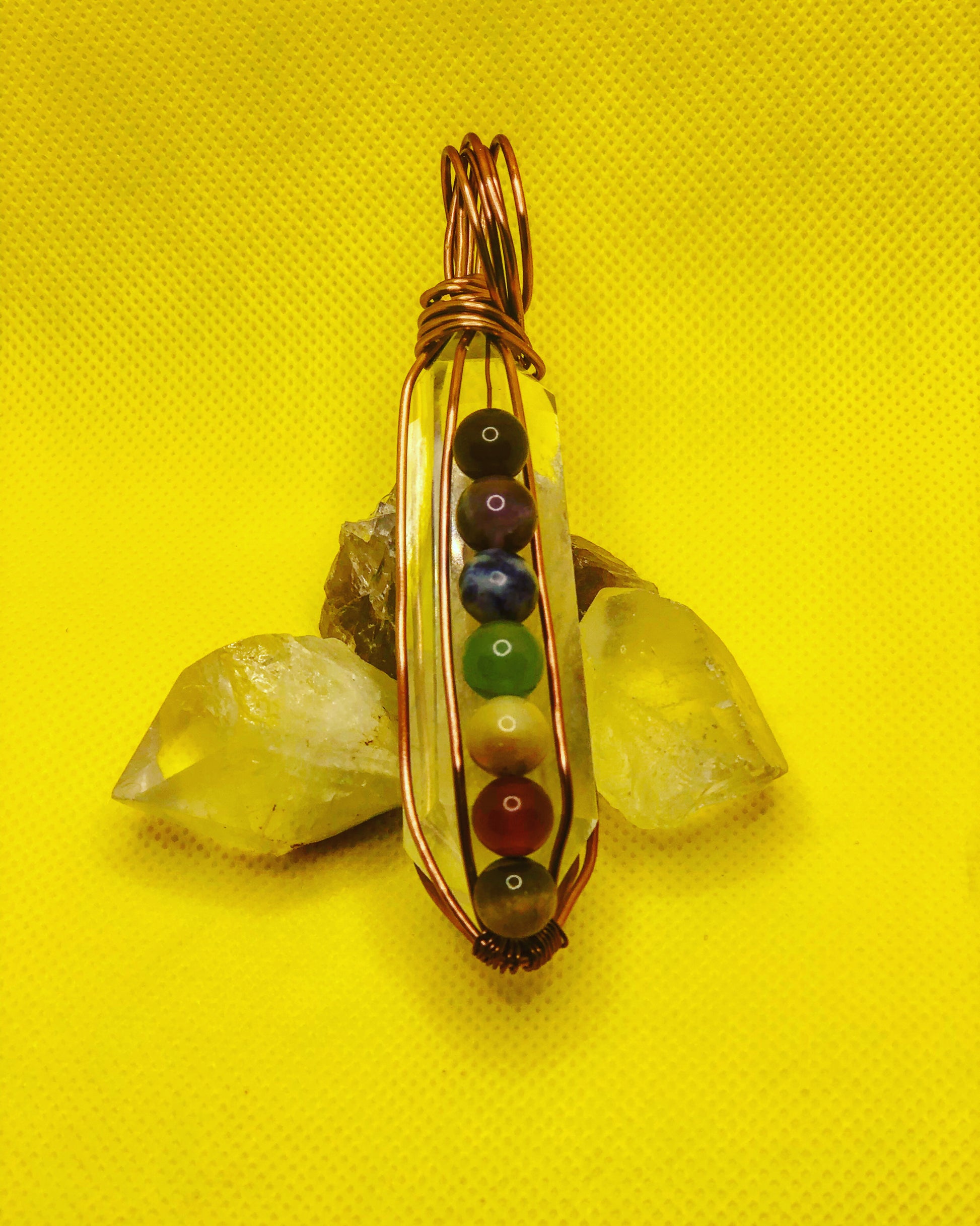 Large 1.5 inch Clear Quartz Crystal with the 7 Chakra Crystals wrapped in copper