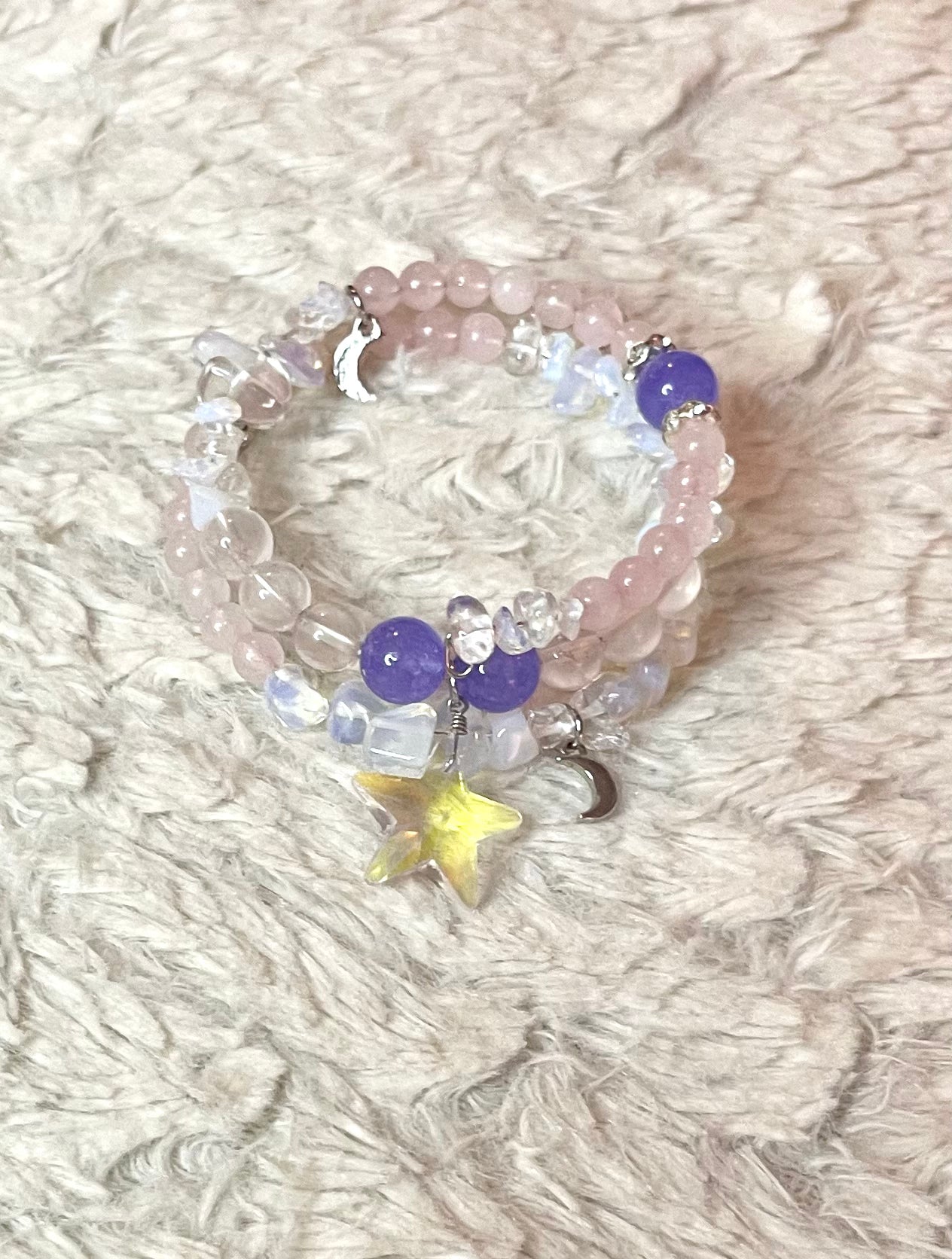Rose Quartz, Opalite and Lavender Quartz spiral wire bracelet