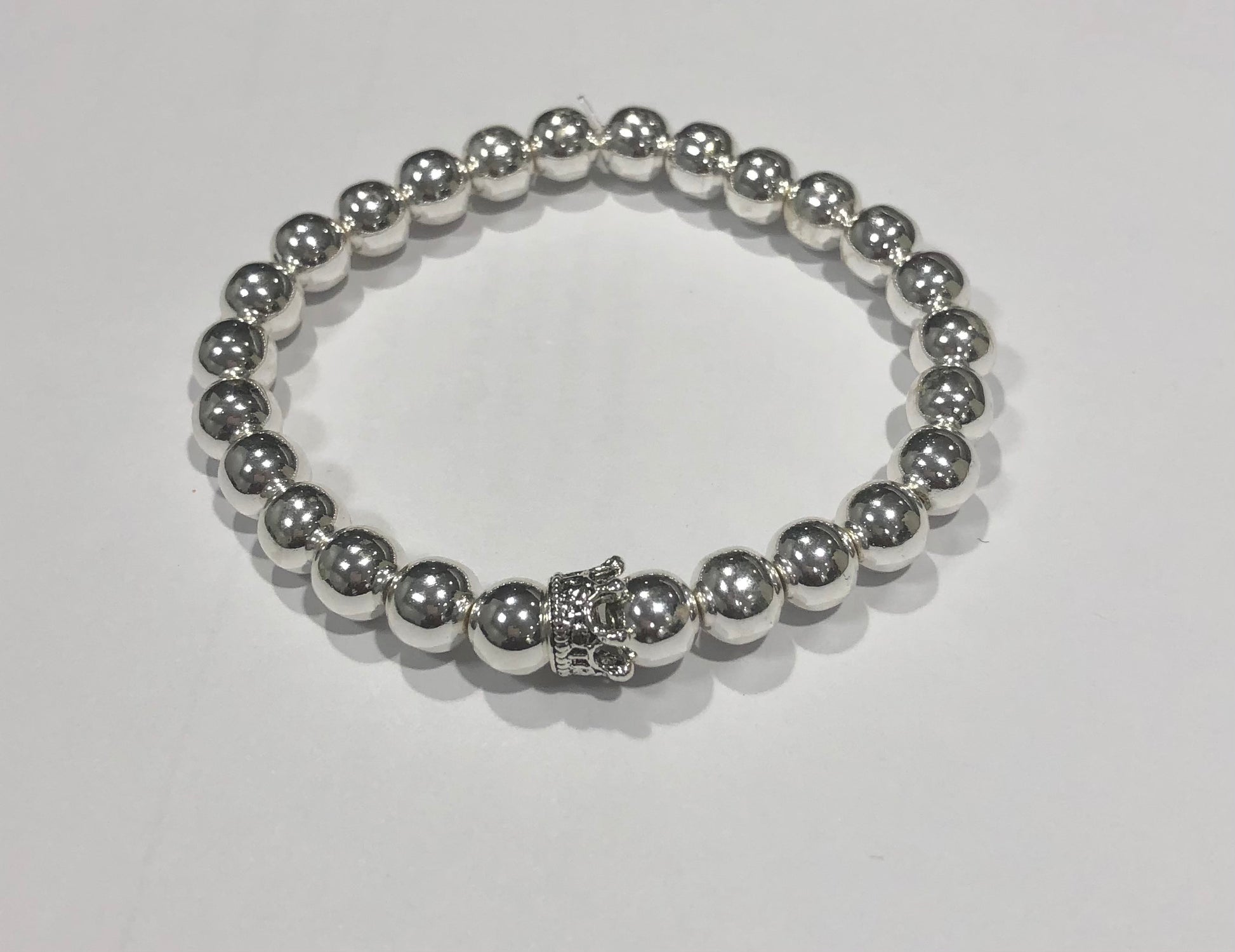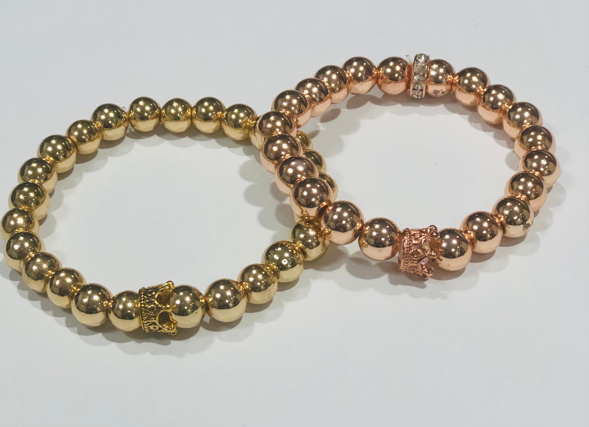 14k gold plated hematite beaded bracelet topped with a crown and a Swarovski Crystal in the center