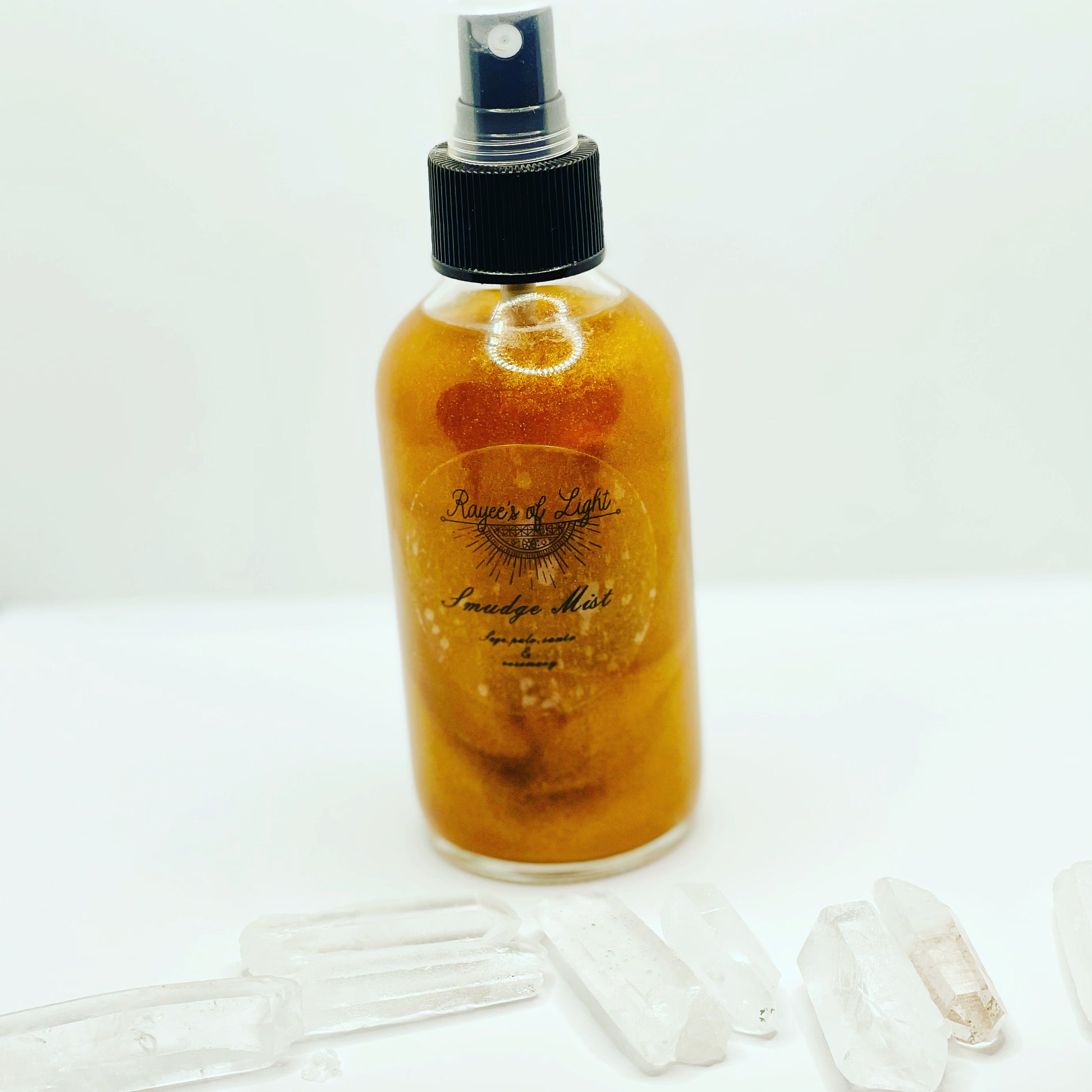 Divine Space is our special blend smudge spray(4oz) and is perfect for workspaces or cleansing on the go. Beautiful and powerfully charged which a raw crystal quartz inside
