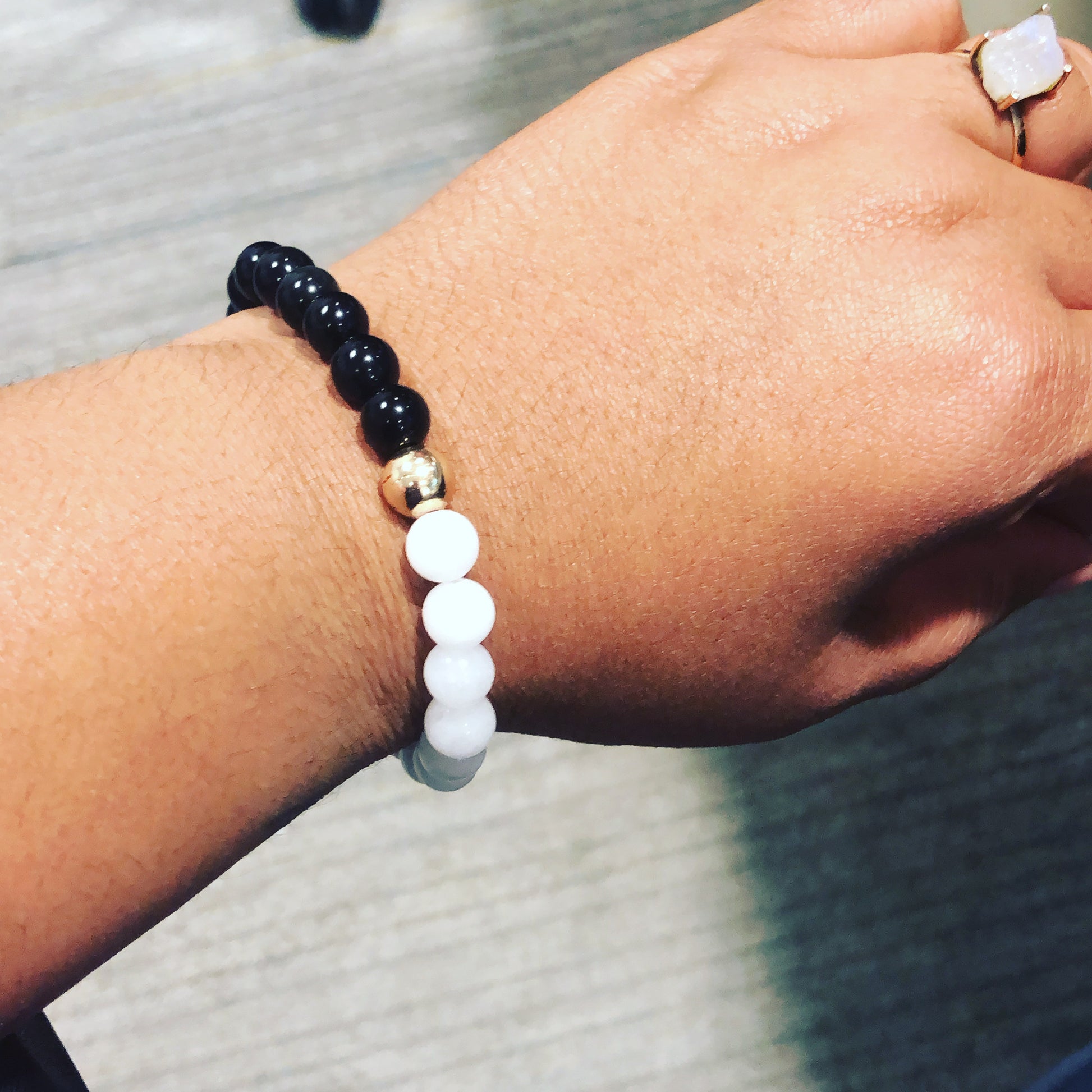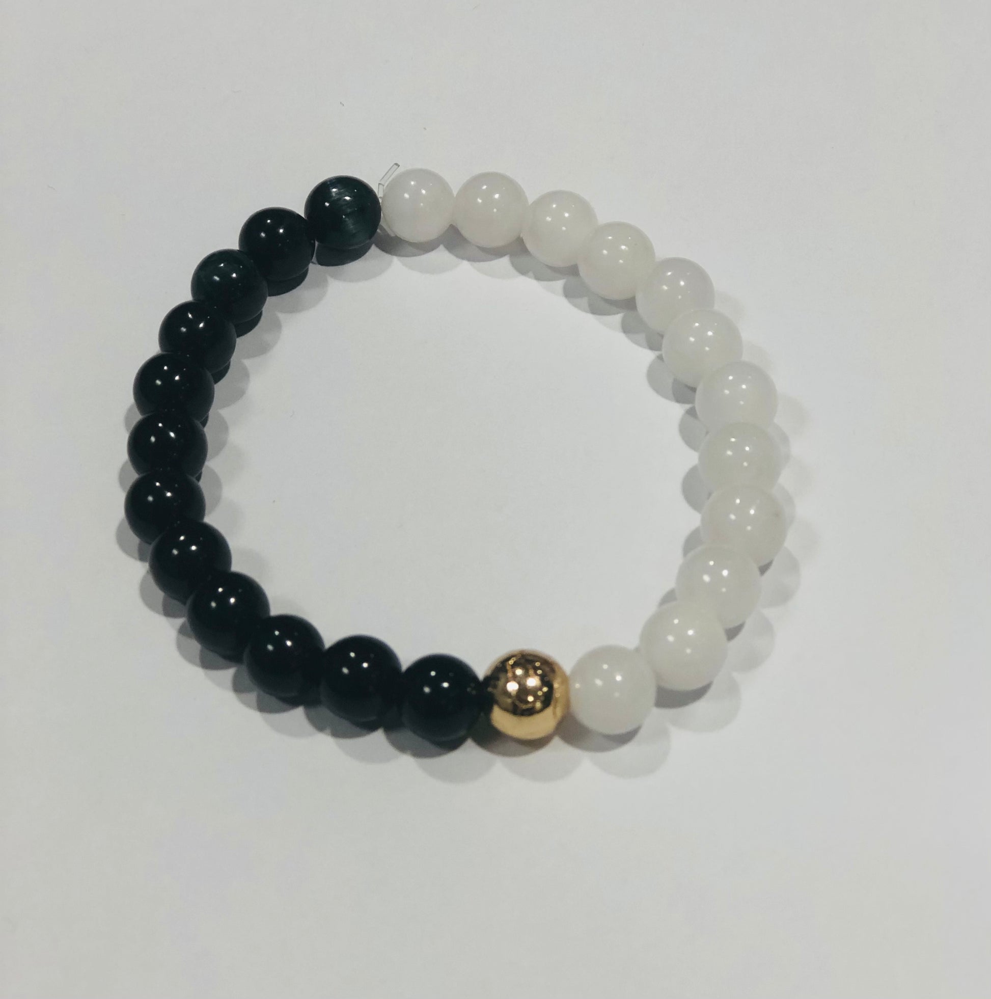 White Jade and Obsidian split by gold hematite. Yin and Yang. Masculine and Feminine. Duality.