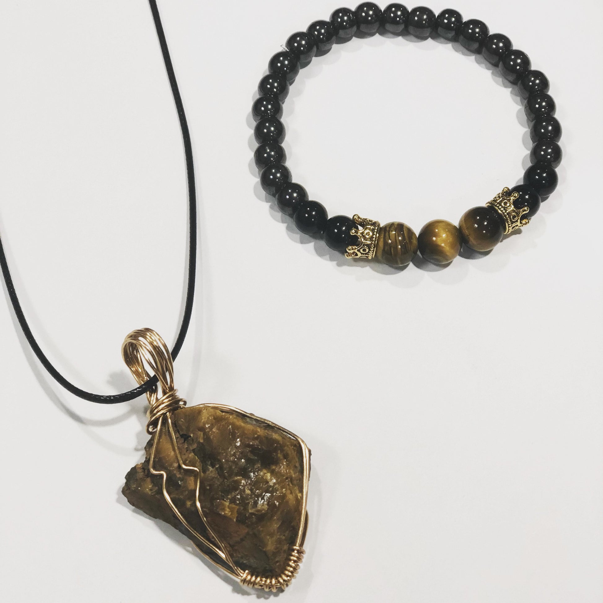 This King Ish set can be purchased together or separate. The pendant is a raw Tiger's Eye stone that will activate your focus and drive. The bracelet is a combination of Hematite for grounding, Obsidian for protection and Tiger's Eye for Ambition.