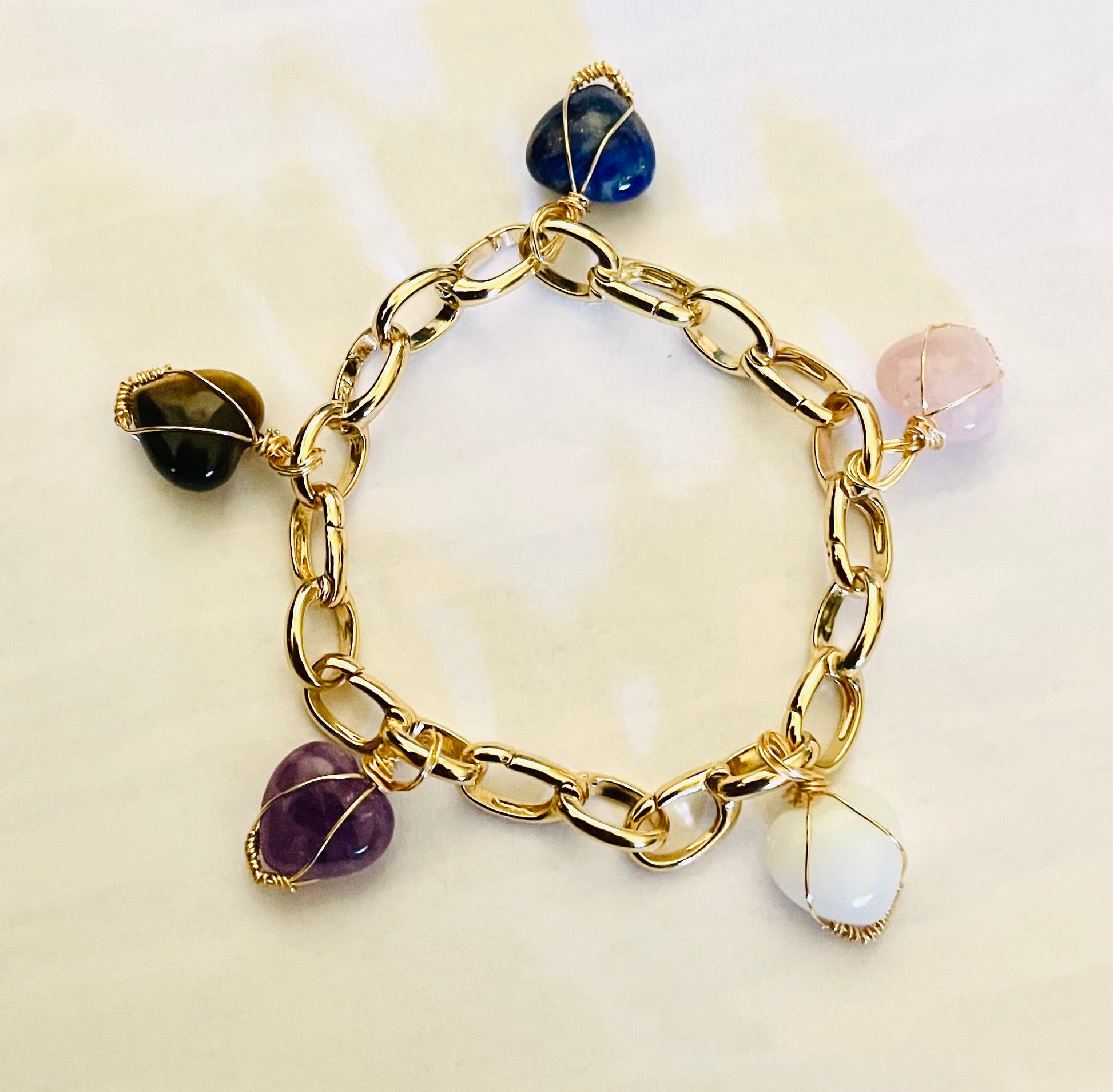 Gold Charm style crystal bracelet with Opal, Rose Quartz, Amethyst, Tigers Eye and Lapis Hearts