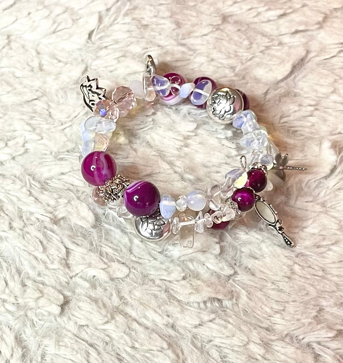 Opalite, pink agate and pink tigers eye spiral wire bracelet with silver lotus charms