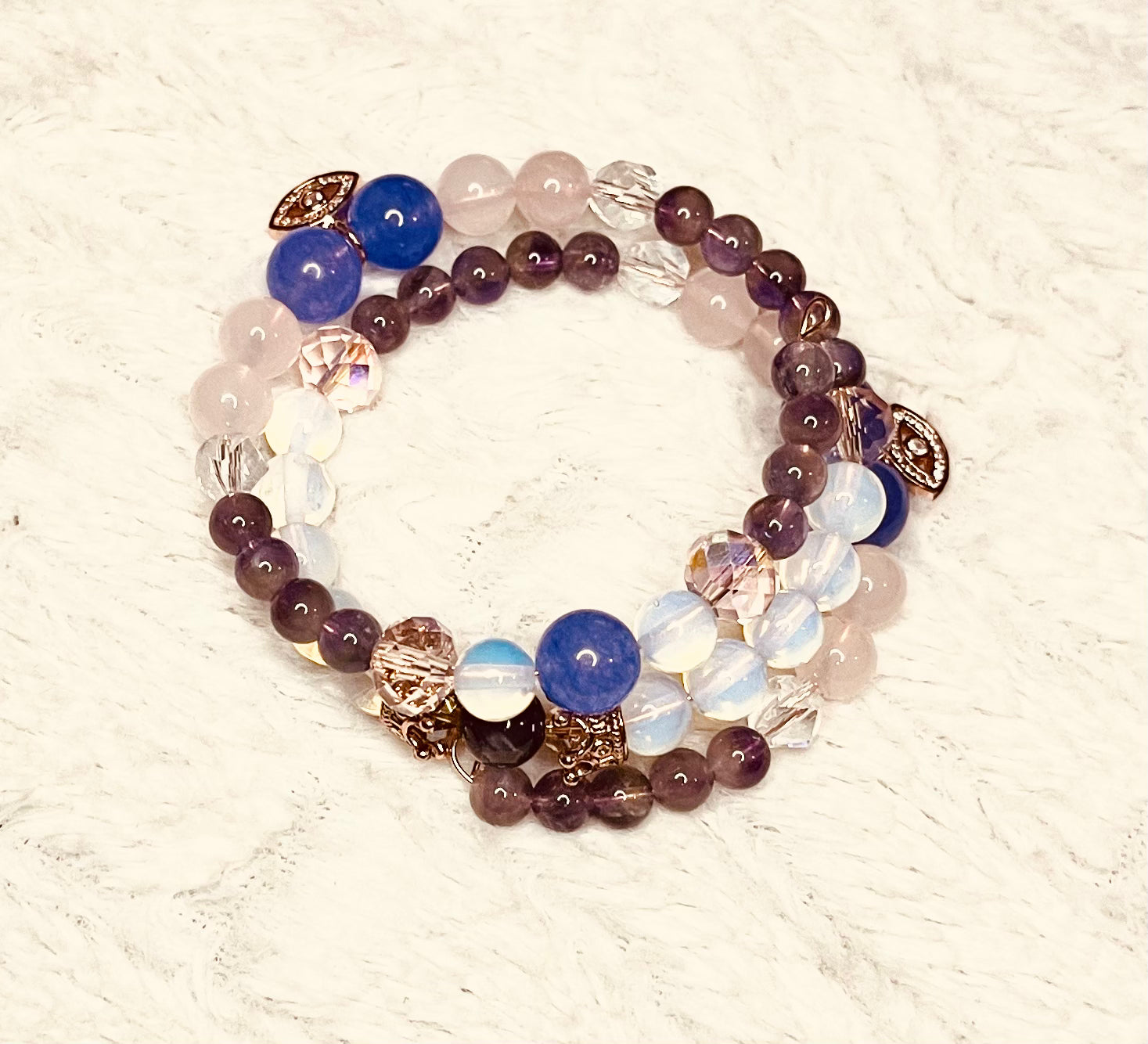 Rose gold spiral bangle bracelet with amethyst, opalite and Rose Quartz crystals adorned with rose gold evil eye charms