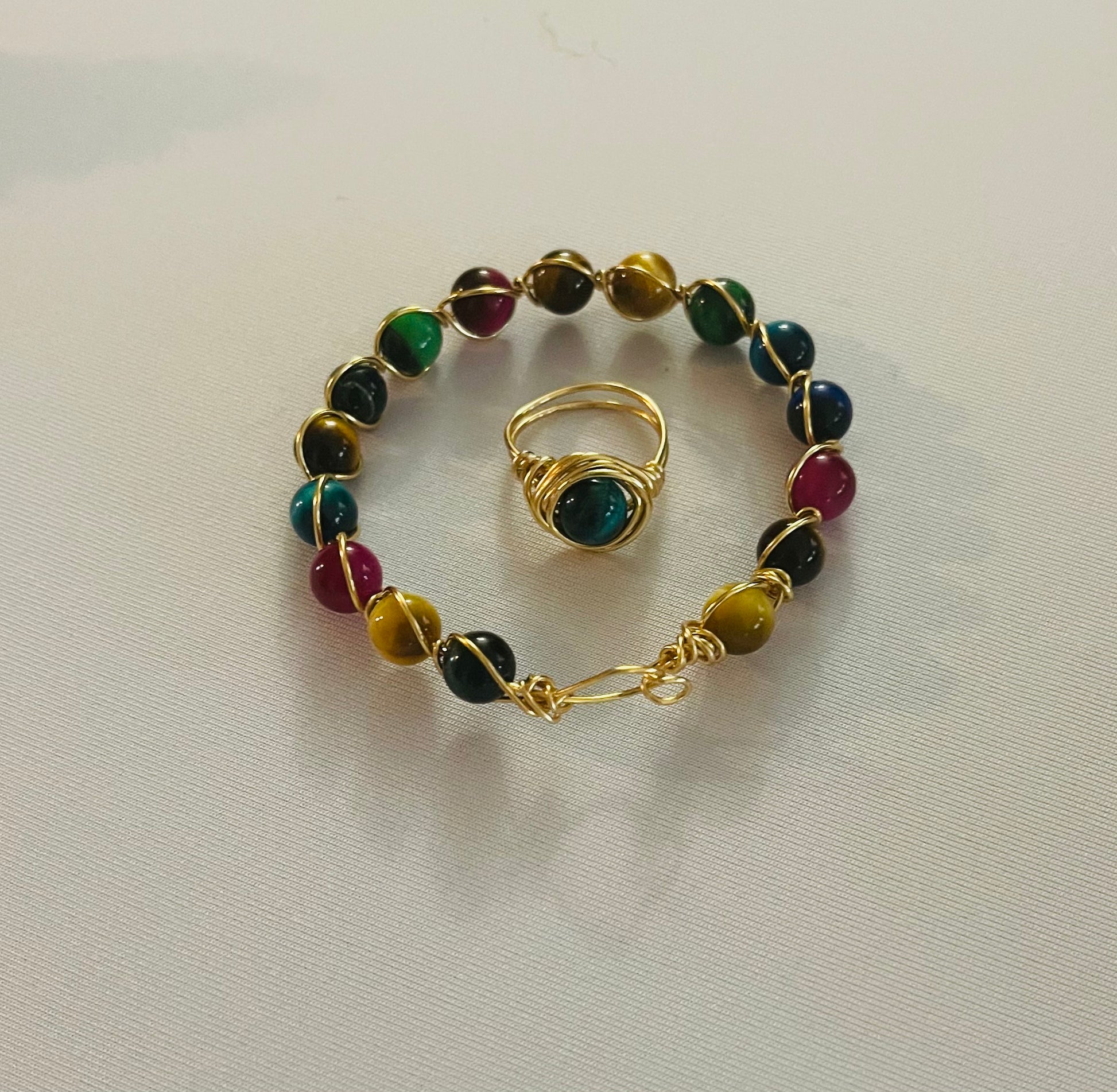 Rainbow tigers eye x gold bangle with matching ring (size 7)