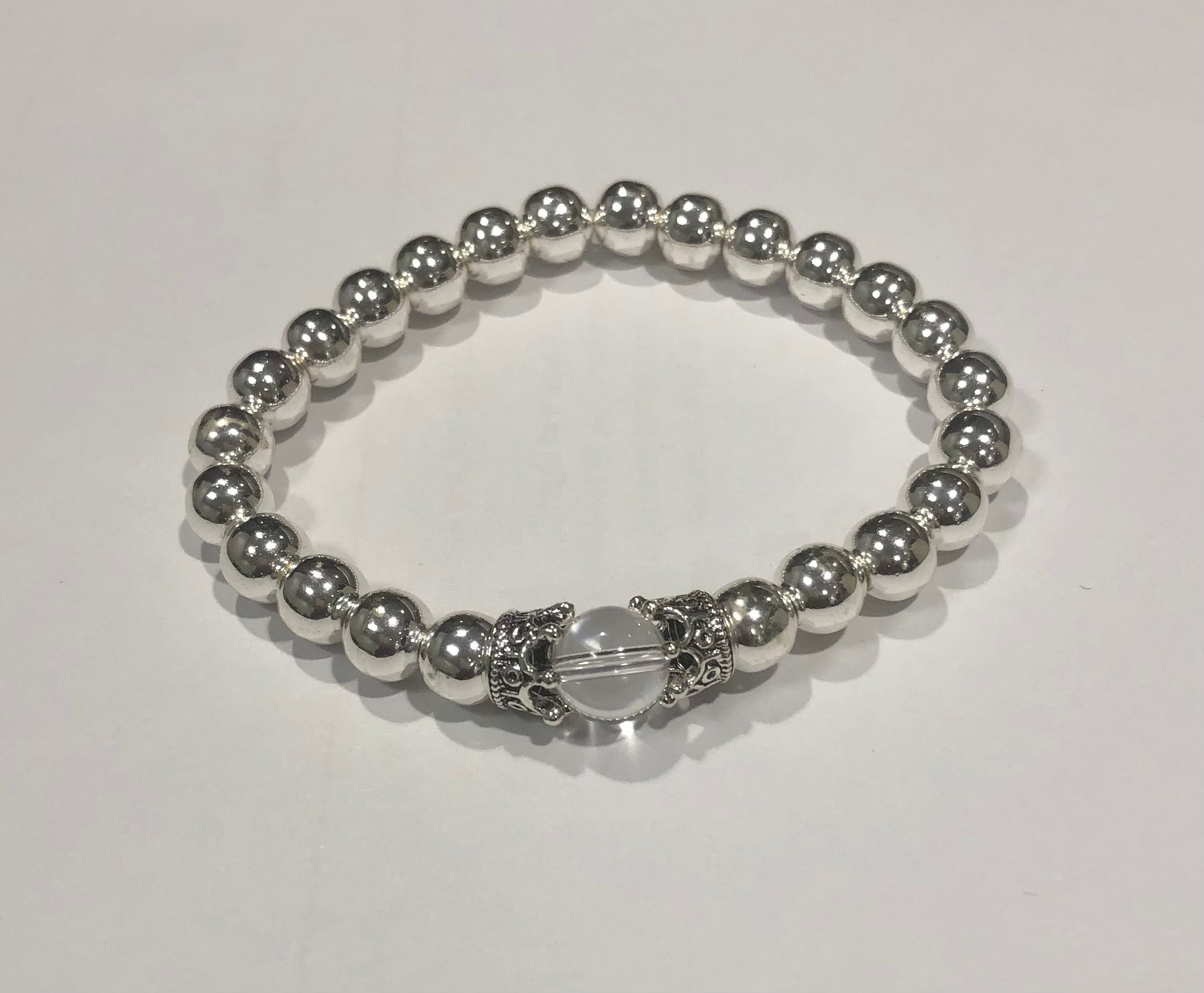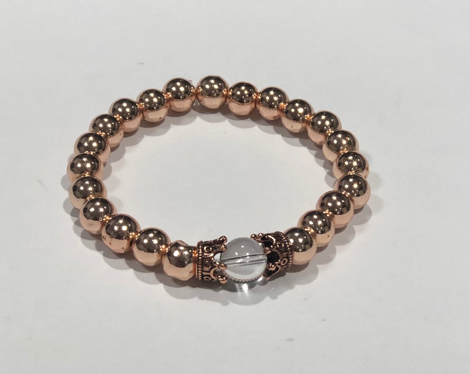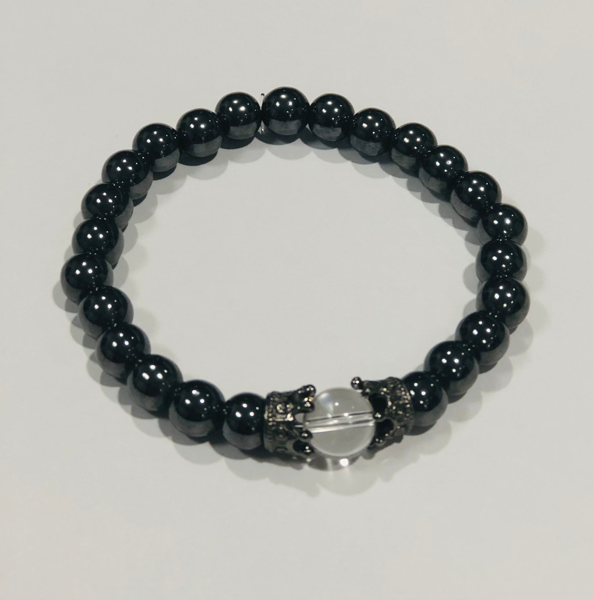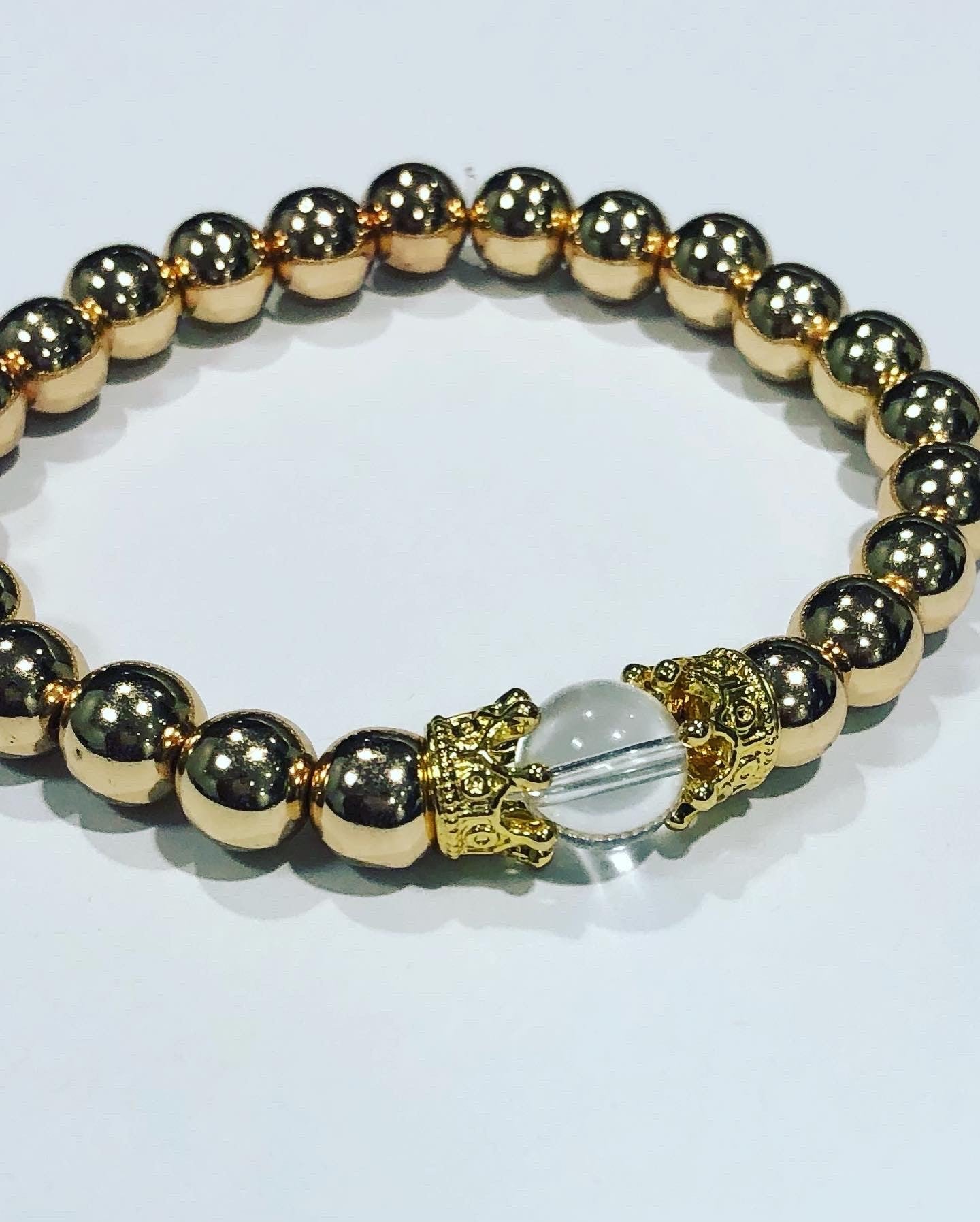 14k gold plated hematite bracelet adorned with a clear quartz between two golden crowns. Add some luxury to you're grounding.