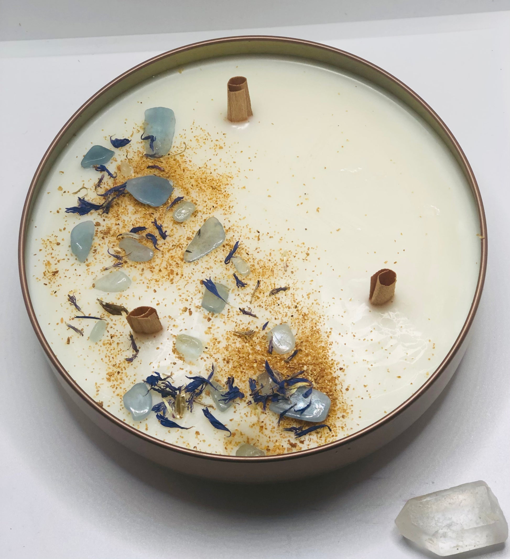 Calm down with Serene. Serene has Vanilla, Coconut, Bergamot and Sweet Orange dressed with Blue Cornflowers and sprinkled with Aquamarine crystals. Guaranteed to take you away.